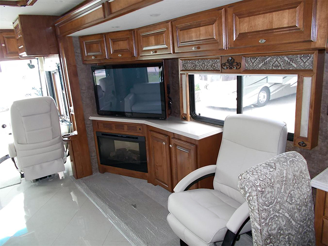 The rear full bath is a great feature and this Phaeton also features a porcelean-tiled living room that includes a fireplace topped with a large flatscreen.