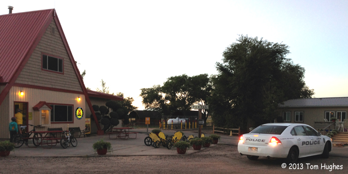 Finally, about that police car . . . one of the Limon KOA owners said she got the heebie jeebies from one of the campers and called the police to check him out. No shots were fired. It’s all cool, but we’re outta here in the morning.
