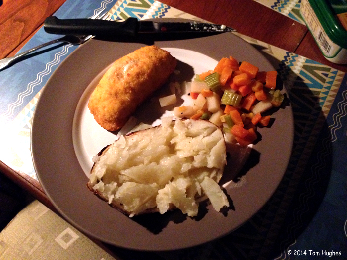 Schwan’s Chicken Cordon Bleu with baked potato and mixed vegetables.