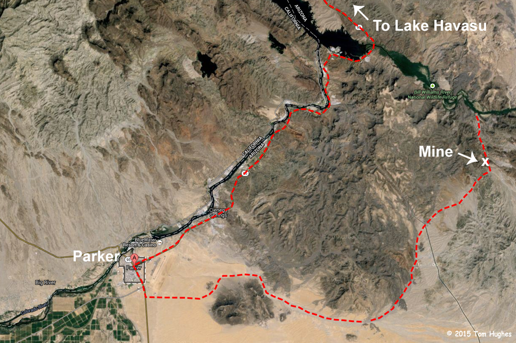 To see an overhead view of the mine site, go to Google Maps and enter these coordinates: 34.228977,-114.006194