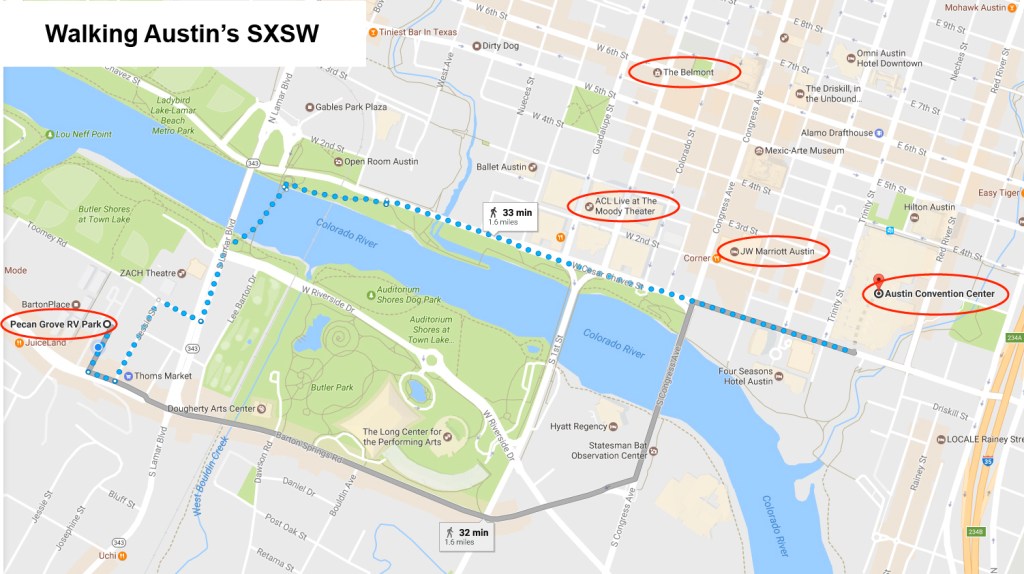 Driving is out. There’s just no place to park, and the center of Austin is a gridlock nightmare. That leaves taxis, the SXSW free shuttle, and walking. (There is another alternative: pedicabs. But these guys wanted an arm and a leg to go anyplace other than the immediate downtown.) I was never able to hook up with the free shuttle and only used taxi service a few times. So, typically, I walked from where we stayed (Pecan Grove RV Park) to each SXSW event.