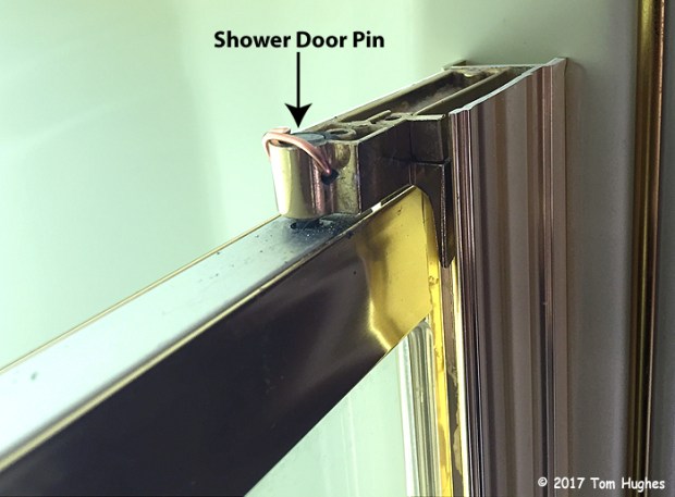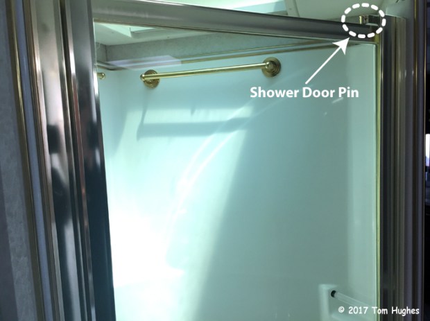 On our shower door’s top hinge, there’s a pin that holds the door on. Sometimes after a long trip, the pin would work its way out. We wouldn’t notice anything was wrong until we tried opening the shower door — then it would fall out into our hands.