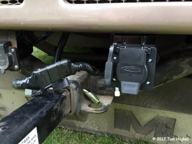 The Tekonsha system comes with a 4-flat output. Because our Jeep is set up for a 7-way interconnect, I purchased a Hopkins Trailer Wiring Adapter that converts a the Tekonsha’s 4 flat output to a 7-way output: