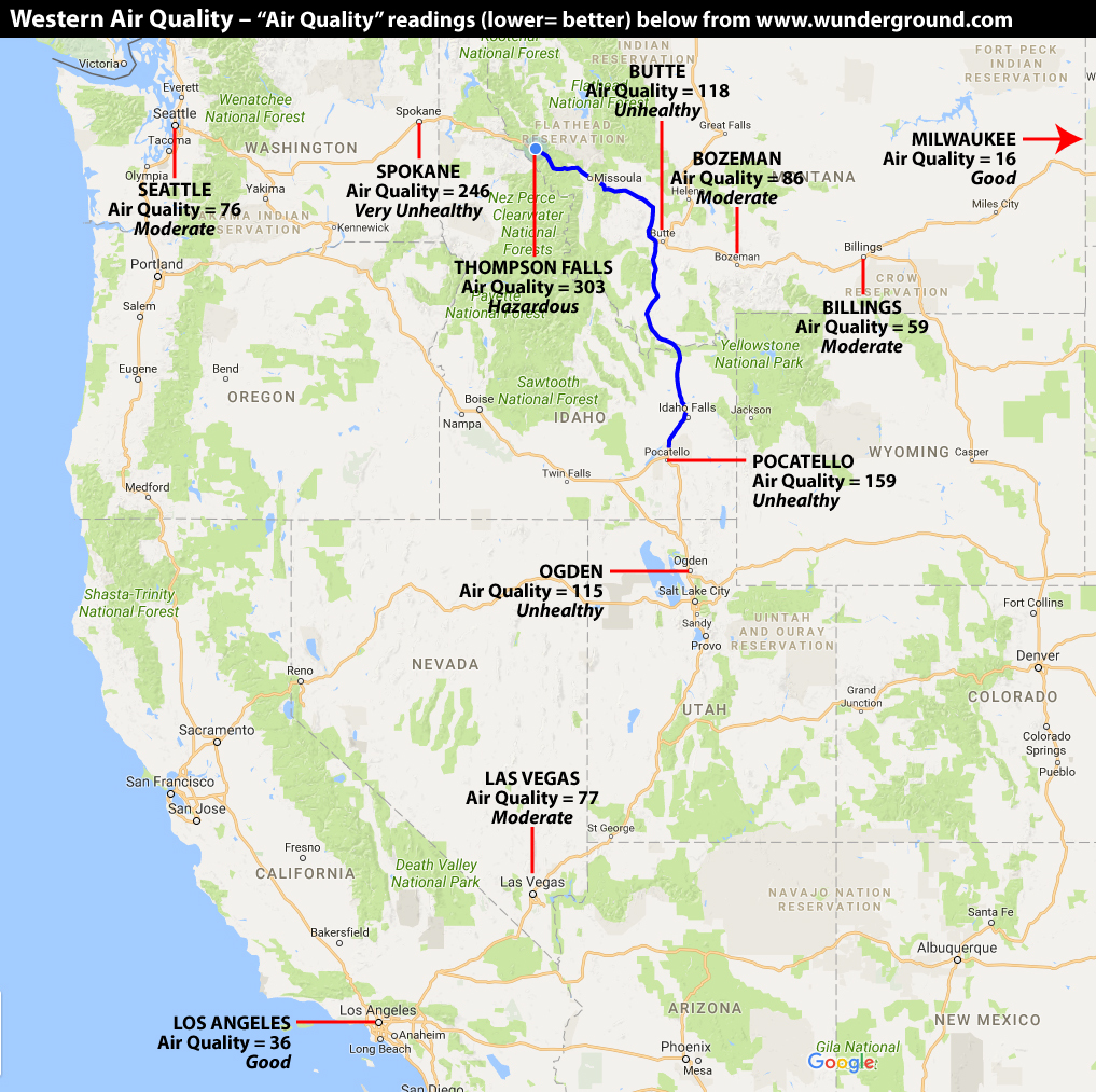 We figured by the time we got into Idaho that the smoke would be gone. Think again. It looks like we’ll be near Las Vegas before the air is clear again.