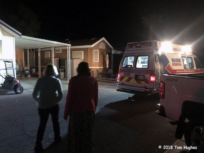 About a week ago as we were watching TV, we saw flashing red lights across the street from us. We went outside and discovered that a friend of ours had taken a hard fall. At our ages that could be serious (said the guy who fell out of his RV front door and sprained his leg).