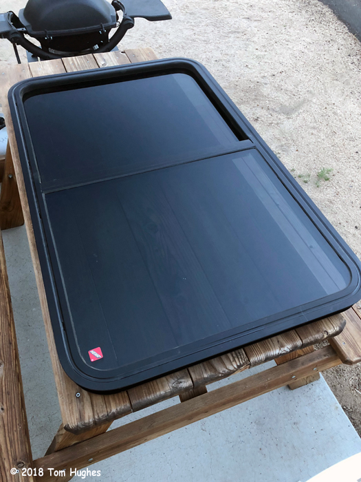 Removing the old window was fairly easy. Unscrew about 15 screws from the inside frame and push. The window should have had butyl tape caulk holding it in place, but there was none. Apparently, when this window was removed for our Residential Refrigerator Upgrade a few years ago, the fridge installers (Master Tech RV) failed to replace the butyl tape.