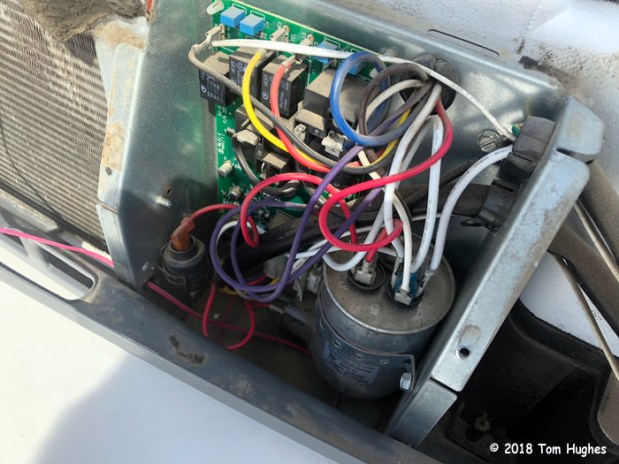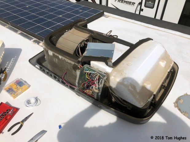 A few days ago while the Bishop temperatures hovered in the mid-90s, our front 6-year-old Dometic Penguin II AC started behaving badly. Its compressor would stay on for 6 minutes, then go off for 4 minutes . . . over and over like clockwork. Although the AC fan stayed on, for 6 minutes we’d have cold air, but then warm air for 4 minutes. That made for not-so-good cooling, and the temperature inside our RV started climbing.