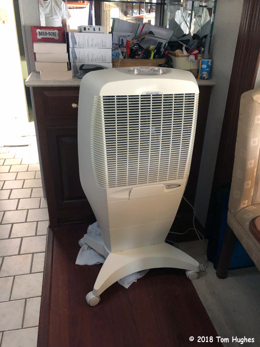 We picked up the only one left at a nearby hardware store. For those of you not familiar with evaporative (or “swamp”) coolers, they’re basically a desert thing. These coolers only work in hot, dry environments because they operate by evaporating water from a porous material by blowing air over that material. Simple and relatively cheap. Swamp coolers are not as “cooling” as ACs, but in a pinch, they’ll do.
