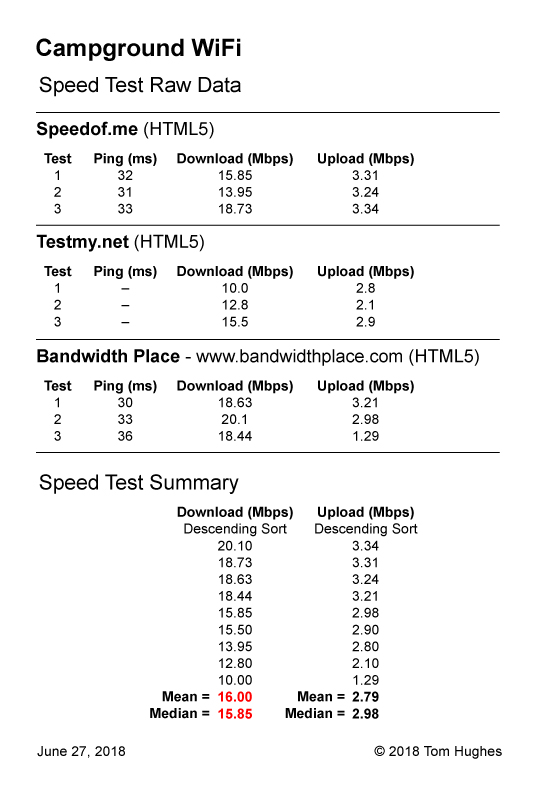 As a comparison, I also ran speed tests on our campground WiFi system and our Suddenlink cable modem.
