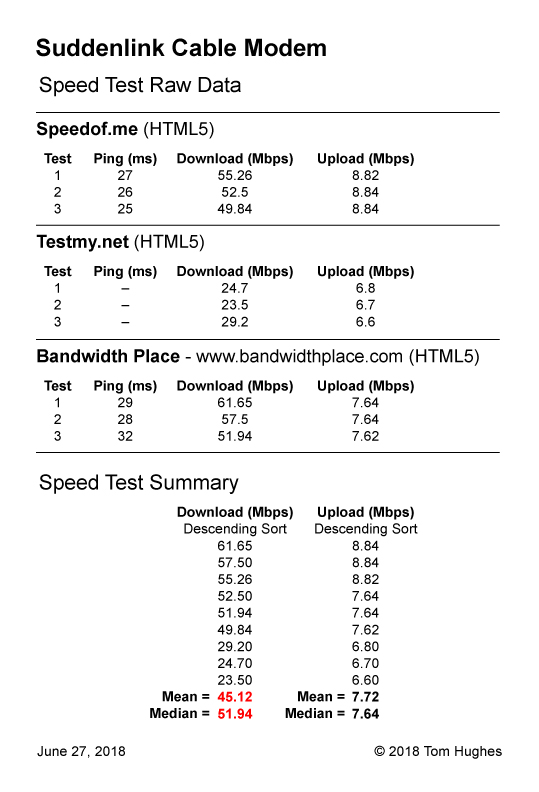 Then I conducted a number of Internet speed tests using several speed test programs. I settled on three HTML5 programs. I discovered some glaring differences between speed testers. For example, a few always ended up with very high download values and one was just plain wrong. It came up with Ping values that indicated the program had somehow exceeded the speed of light.