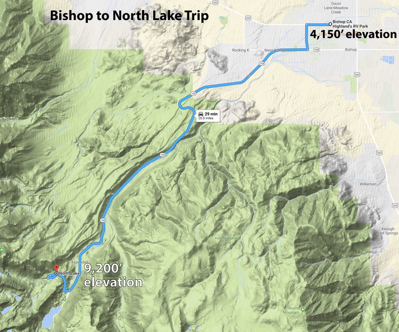 Finally, I don’t remember the drive up to North Lake. I think I blacked out. You see, about 2 miles of the trip up were negotiating a one-lane road with sheer drop offs. I know we encountered a couple of huge pickup trucks coming down the mountain as we drove up, and we survived.