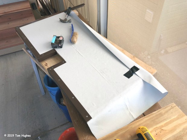 Anyway, we used a paint roller to spread the Elmer’s Glue all over each plywood sheet, then used a padded squeegee to flatten out the Superflex and remove all the air bubbles. For the most part it worked out ok.