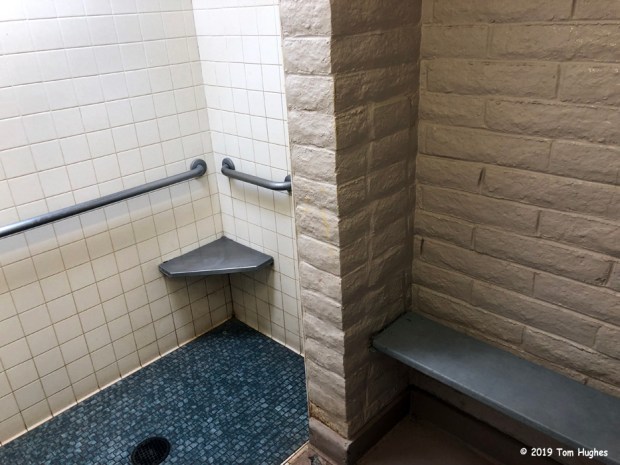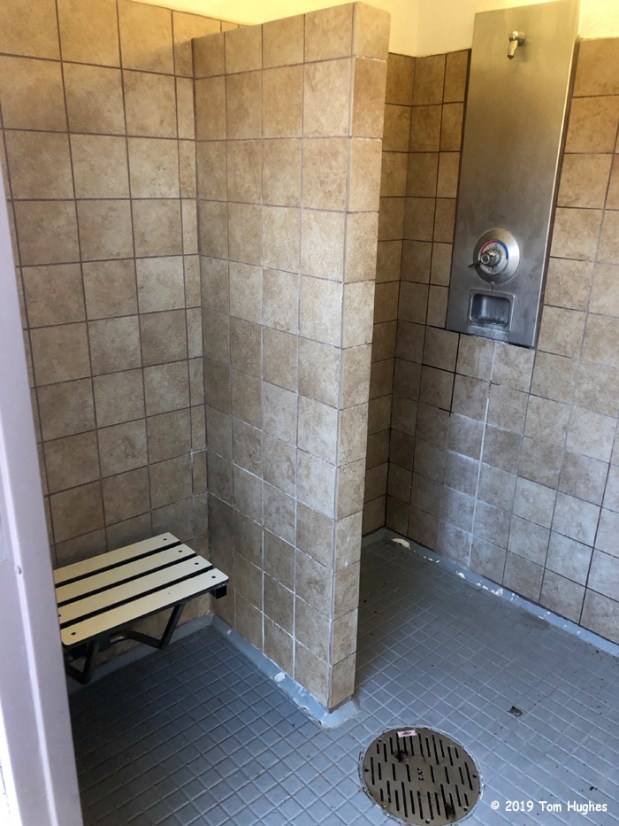 This campground brings back memories for us. It reminds us of all the Wisconsin state parks we stayed at years ago. Electricy and water. No sewer hookups. So it’s campground shower time as our RV holding tanks would fill up mighty fast if we showered in our Newmar. Doing laundry is out too.