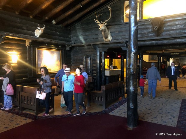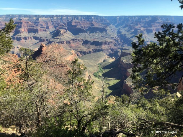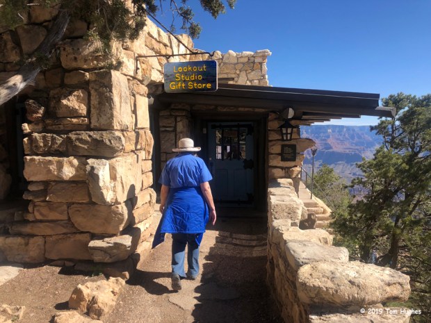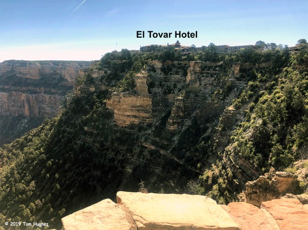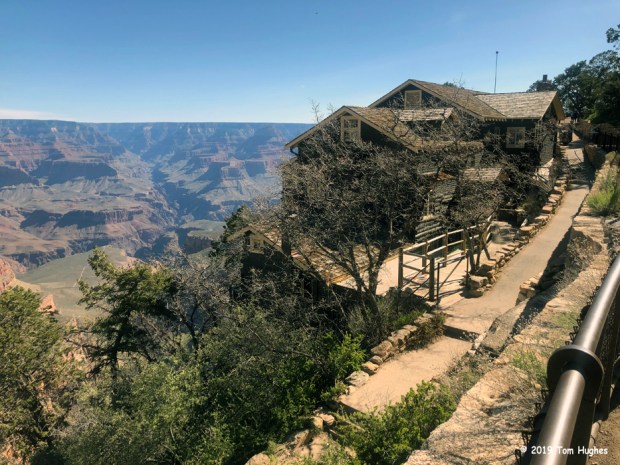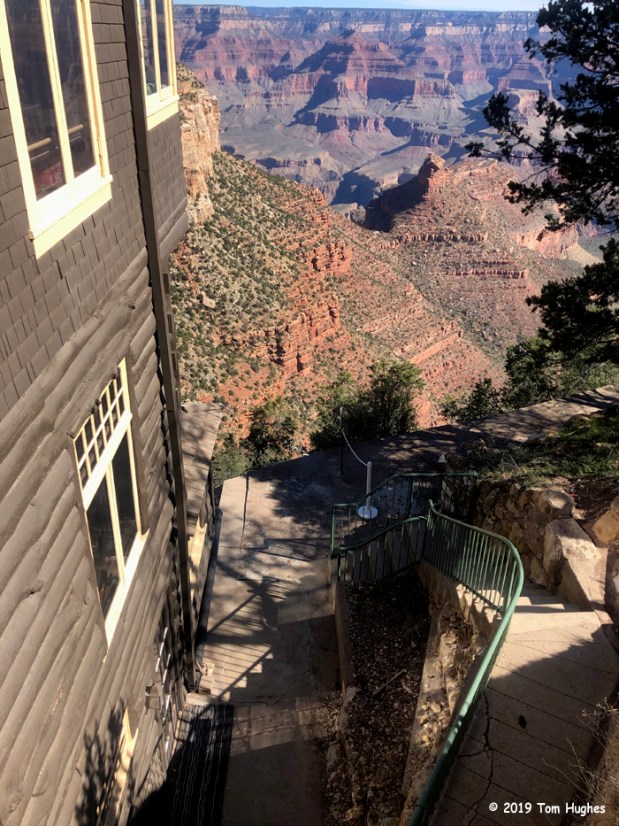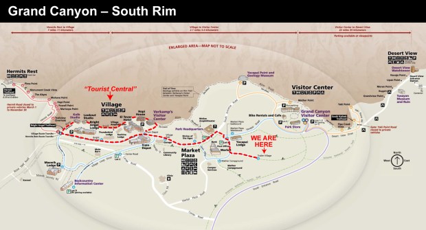 At about 8 am we caught the Blue Line bus to the end of the line — the Bright Angel Trailhead. From there we walked the Rim Trail through “The Village”. We had breakfast at Bright Angel Lodge, visited El Tovar Hotel (where we stayed 25 years ago), had ice cream, bought stuff, and snapped photos along the way.