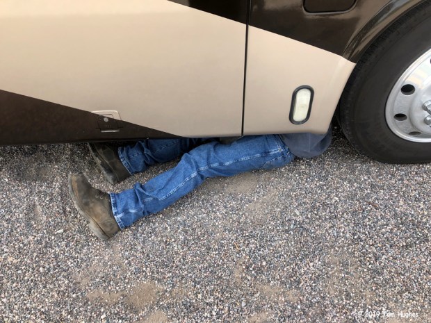 However, the following morning when we tried to raise our jacks to leave, they all stopped halfway up. Bad mojo. We tried lowering them, but no go. Also, a nasty little “LOW BATTERY” red light appeared on our HWH jack control panel.