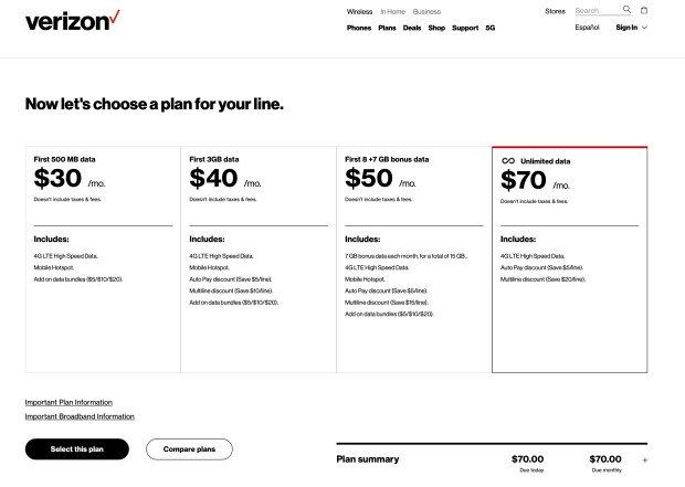 (4) Finally, after selecting a device, you select the Unlimited data plan from this page: