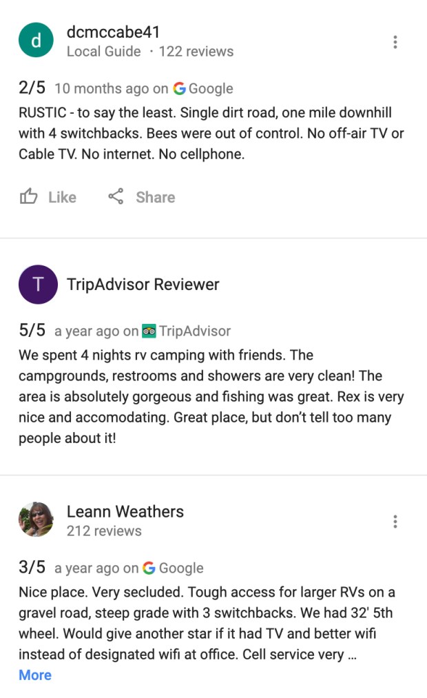Campground reviews are indespensible. Usually I check Campground ReviewsΒ (which are incorporated into RV Trip Wizard), Google/Trip Advisor reviews, Campendium, and RV Parky.