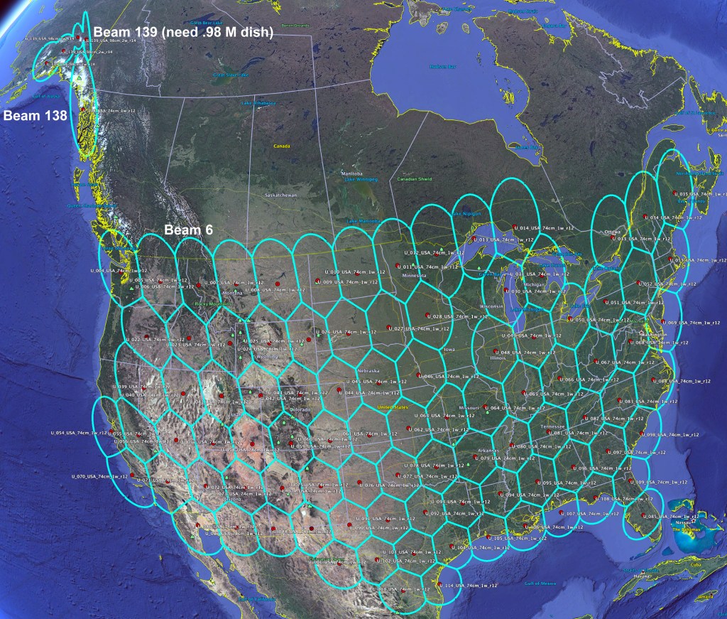 With the older Ku-band (“Your father’s HughesNet”) satellite Internet service, you could get service in much of Canada and Alaska. The only “gotcha” was signal strength. The further north you went, the weaker the satellite signal (measured in dBW). So in the far north you needed a .98M or 1.2M satellite dish — that’s about 39 and 47 inches, respectively. Those are big, unwieldy dishes.