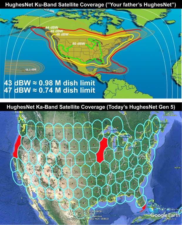 That’s the rub. The “old” HughesNet (or Ku-band for the geeks) covered wide areas while the newer Gen 5 HughesNet (or Ka-band) uses smaller, focused spot beams.