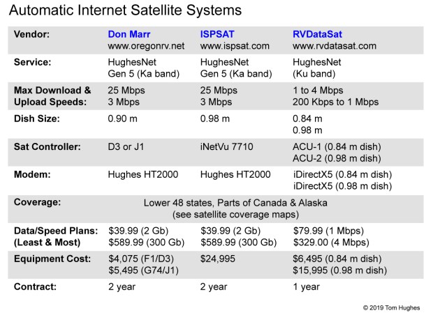 This is a HughesNet Ku-band satellite system, essentially it’s the one your dad used. It’s a modern MotoSat. While the RVDataSat data plans tout no caps “unlimited” download capability, the fastest plan tops out at 4 Mbps — and that’ll cost you $329/month. Also, unless you like streaming video in the wee hours of the morning, then this system probably isn’t for you.