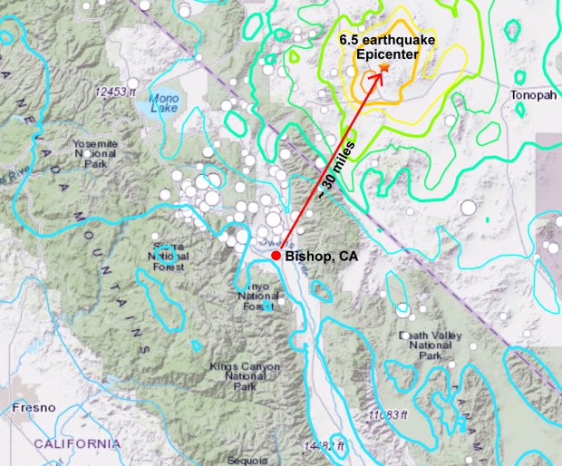 This one was a 6.5 earthquake centered in Nevada about 30 miles northeast of Bishop, CA. It woke me up at 4:00 am this morning. At first I though it was a strong gust of wind, but then it kept on coming. Still exciting.
