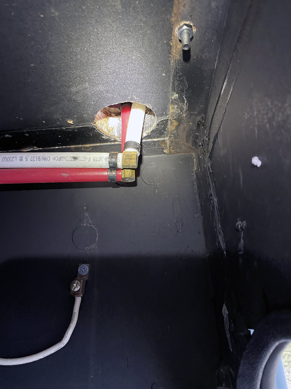 First, a small hole saw opening, then a 2″ x 6″ cut in the Sea View’s driver side wallNow I was able to confirm that the leak was not coming from either of the water line’s 90-degree fittings