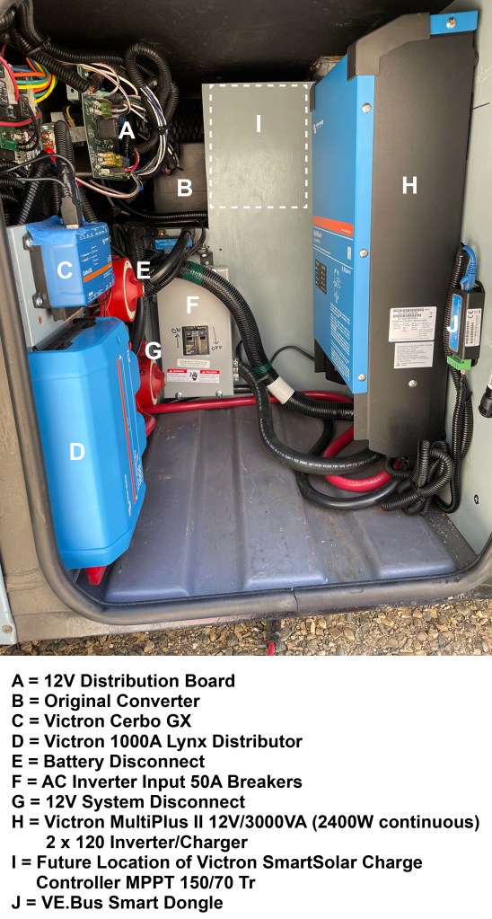 Victron equipment is very good. Well designed, very functional, and pricey. The MultiPlus II is no exception, but OMG it’s heavy (50 pounds) that had to lifted onto a metal hanger – that you can’t see as you lift.