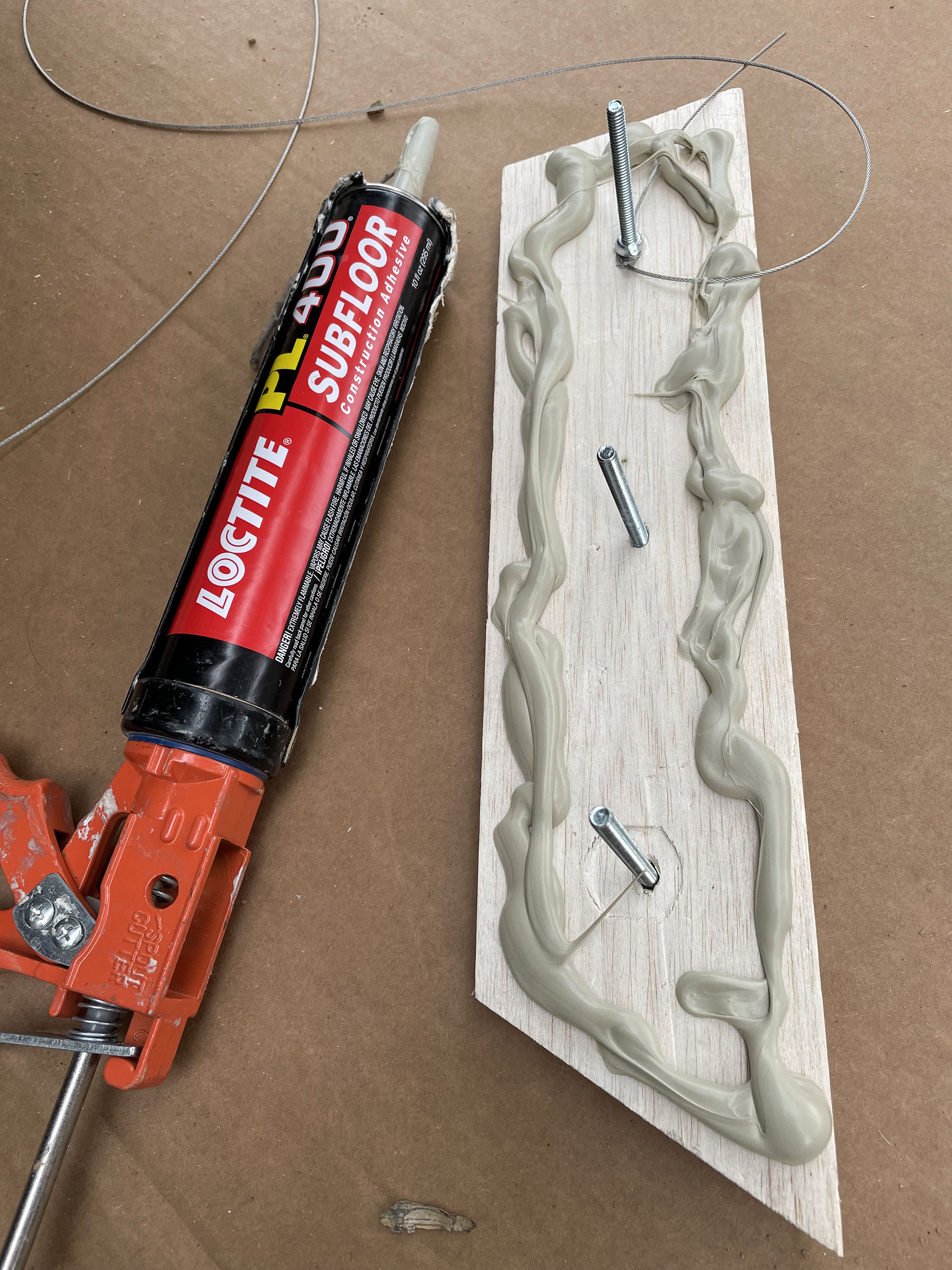 Each wood strip was liberally coated with PL 400 adhesive and then lifted up into place with a metal string. Very, very clumsy.