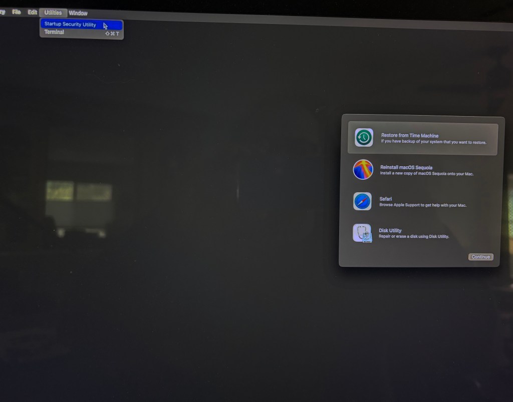 Finally, I thought I was getting somewhere. I selected “Exit to Recovery” and then selected the “Startup Security Utility” in order to get around the T2 security chip: