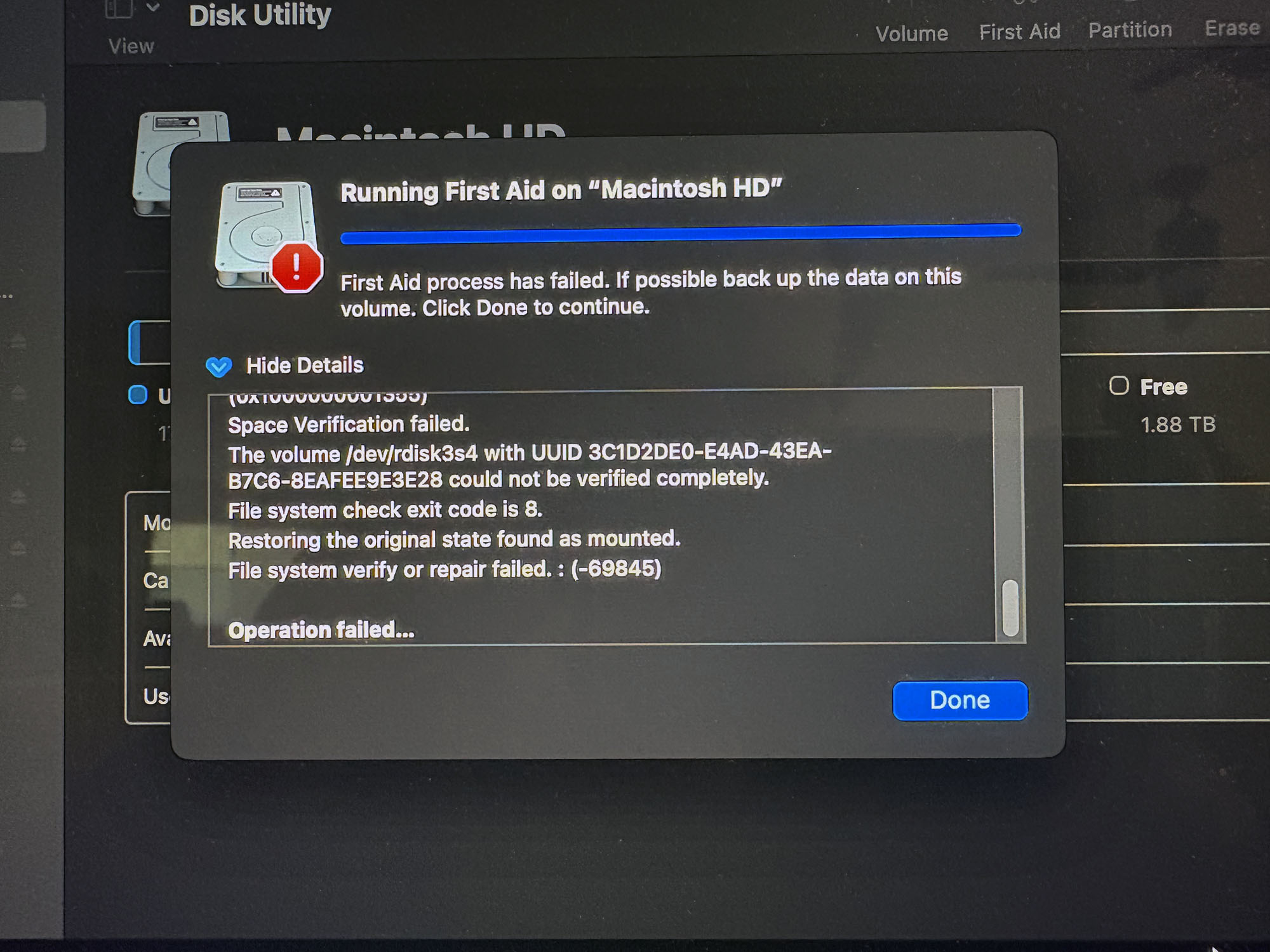 After too many of these screens of death, I decided to reinstall the MacOS on my iMac. However, first I tried running the Mac’s Disk Utility First Aid, but that failed. After several attempts, First Aid kept failing.