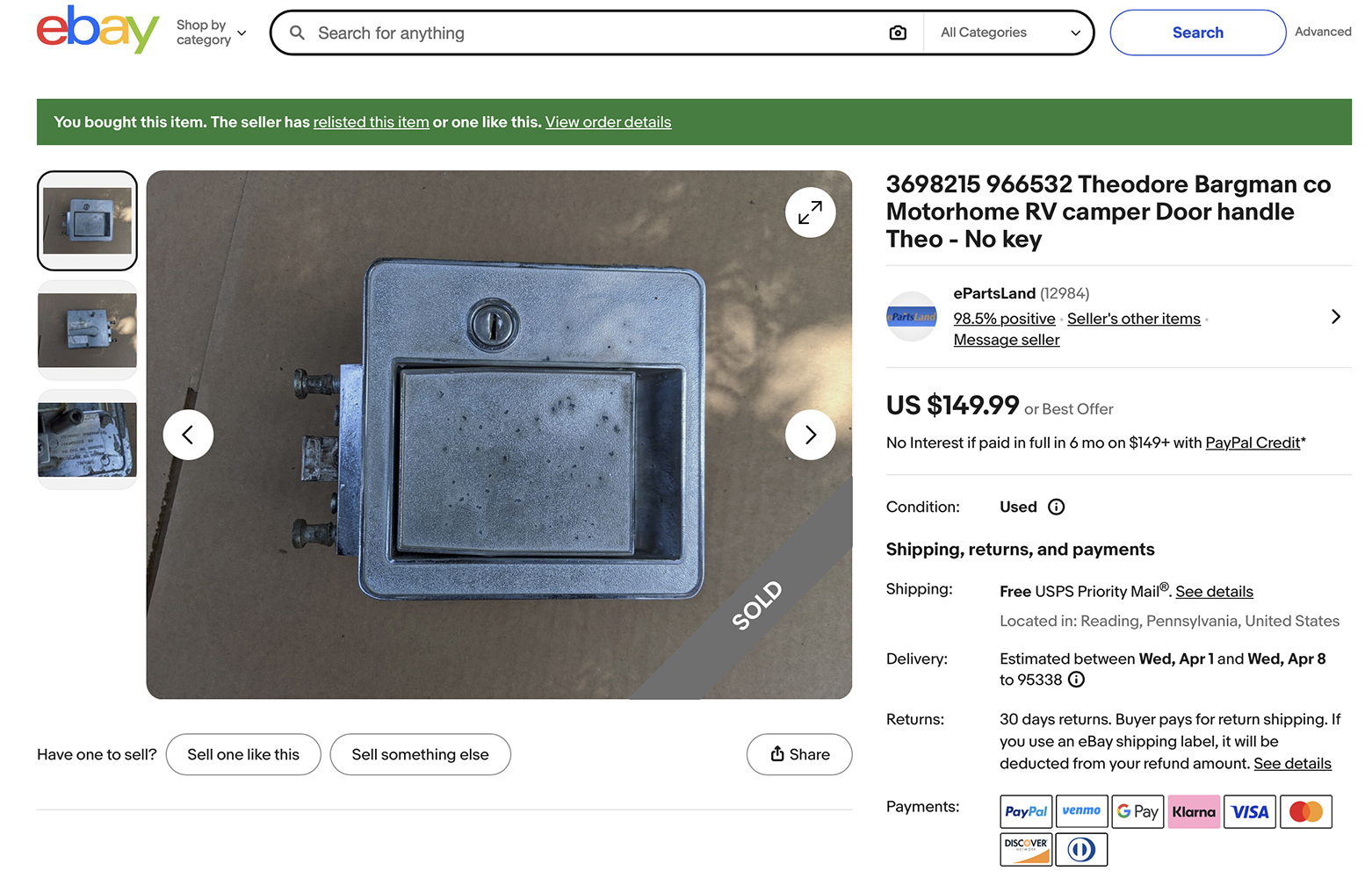 Discovered that the original door latch was made by Bergman which stopped manufacturing them in 2011. SOL.