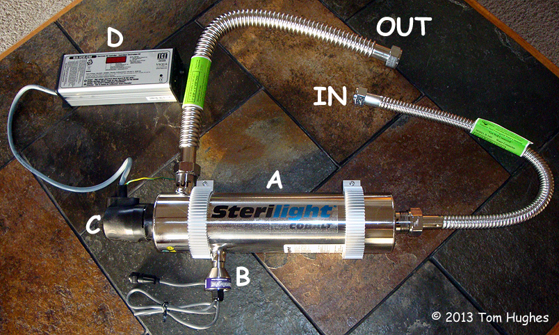 The major parts of the Sterilight are (A) the stainless steel chamber, (B) UV intensity meter, (C) UV bulb, and (D) UV intensity monitor which lets you know when to replace the bulb.