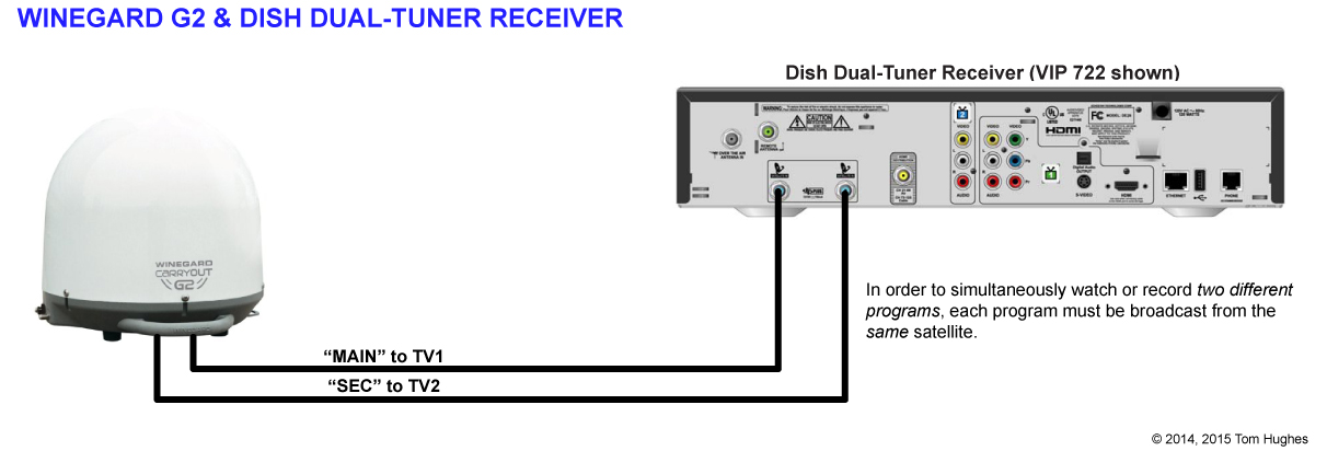 If you want to use a dual-tuner DISH receiver like a 722 with a G2, connect it like this . . .